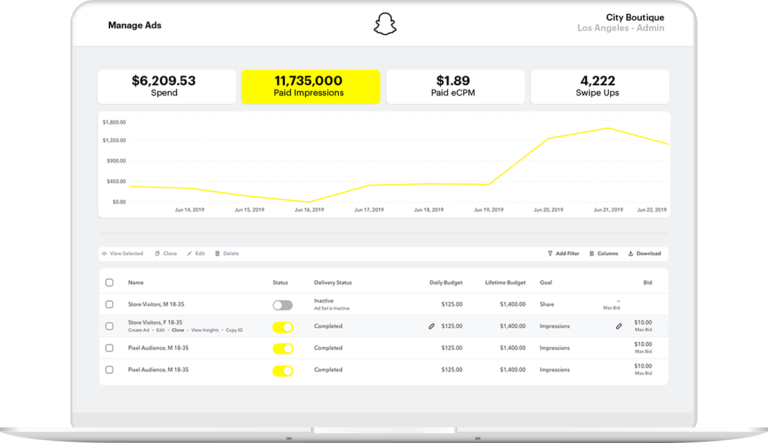 Snapchat Ads allows businesses to digitally advertise their goods and services on their always-popular social media platform. These ads can appear as sponsored lenses and geofilters, story ads, and snap ads.